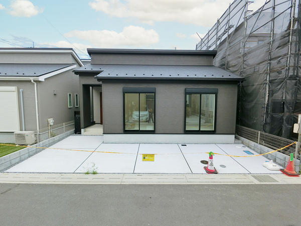 黒を基調とした外観が印象的。洗練されたデザインの平屋住宅です。大きな窓が採光にも配慮されたデザインとなっています。前面スペースもゆとりがあり幅広い用途に対応しやすいです。