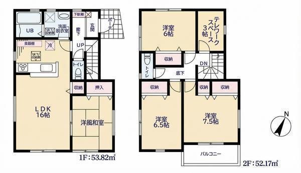 各部屋に収納スペースを備え使い勝手を重視した間取りです。水廻り集中設計で朝の忙しい時間もスムーズに!