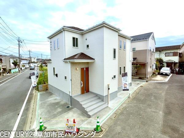 角地に建つ新築一戸建ての外観。開放感があり、風通し良好。家族が快適に暮らせる、安心感とゆとりのある住まいです。