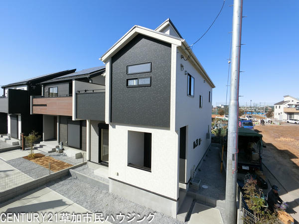 シンプルなデザインの住宅が並ぶ前面道路は新しい生活を始める魅力的な場所です。周囲の環境と調和したカラーリングが住まいの魅力を引き立てます。