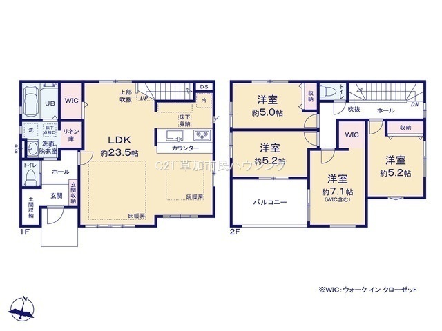 リビングイン階段で家族のつながりを育み、WICが2ヶ所や土間収納、リネン庫で収納力も充実。
