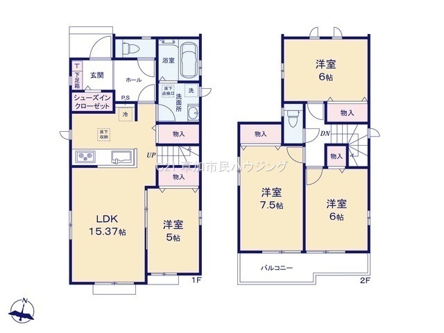 家族が自然と集まるLDK15帖以上、会話が弾む開放的な対面キッチン、家族のつながりを育むリビングイン階段、ゆったり寛げる主寝室7.5帖、全居室収納付きでお部屋もすっきり、靴や小物をすっきり収納できるSIC、家庭菜園なども楽しめるワイドバルコニー、さらに毎日のお買い物にも便利なスーパー徒歩1分圏内の心地よい住まいです!