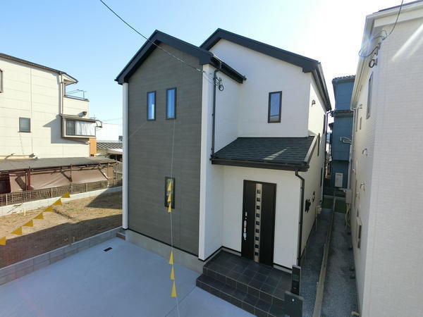 シンプルで洗練された外観が特徴の住宅です。落ち着いた色合いで周囲の景観とも調和しています。玄関アプローチが広くゆとりを感じられます。駐車スペースも確保されているので使い勝手も良好です。
