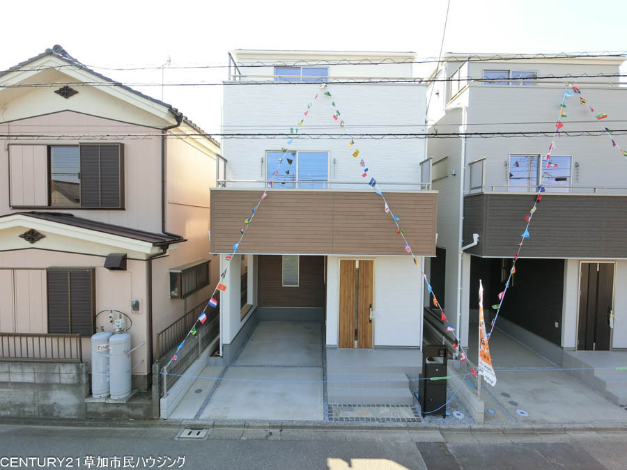 全2棟、LDK16帖以上、対面キッチン、リビングイン階段、水廻り集中設計、全居室6帖以上、収納充実、WIC、納戸、ビルトインガレージ、バルコニー×2