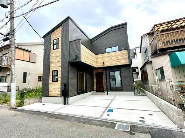 モダンなデザインと落ち着いた色合いが印象的な外観です。木目調のアクセントが温かみを演出しています。広々とした駐車スペースも確保されています。シンプルながらも存在感のある佇まいです。