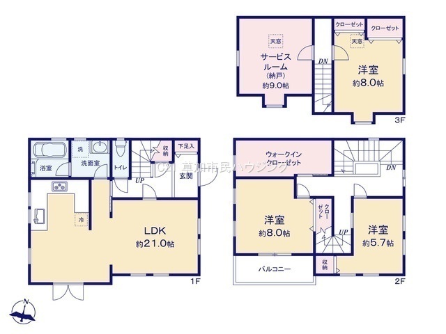 三階建ての間取りでゆとりある21帖のLDKが1階に配置されています。二階にはウォークインクローゼットを備えた洋室があり収納スペースも確保されています。