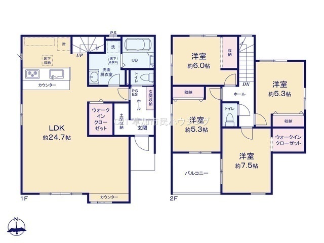 1階と2階に分かれた使いやすい間取りです。各部屋に収納スペースがあり住みやすさを感じられます。2階にはバルコニーやトイレもあり快適な設計となっています。リビングダイニングキッチンの広さも魅力です。