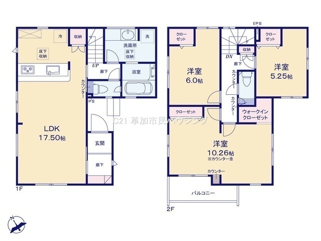 駐車2台可、LDK17帖以上、カウンターキッチン、WIC有、主寝室10帖、間仕切り可、商業施設充実