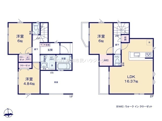浴室乾燥機や全居室収納、WIC、バルコニー×2、ビルトイン車庫1台分など設備も充実。