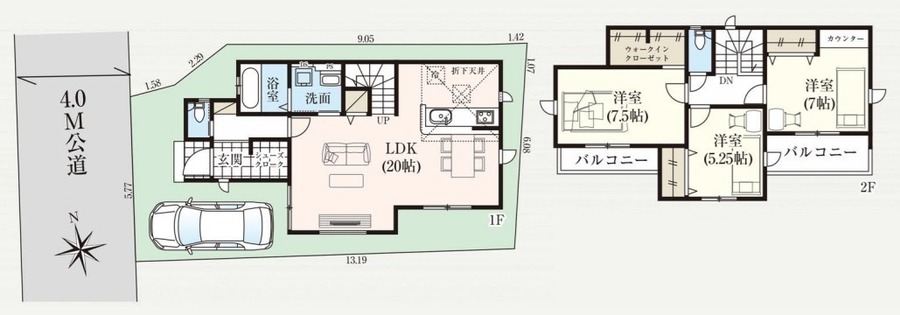 駅徒歩7分、全居室南向き、LDK20帖、対面キッチン、リビングイン階段、全居室収納、WIC、SIC、主寝室7.5帖、南面バルコニー×2、ZEH水準仕様、長期優良住宅