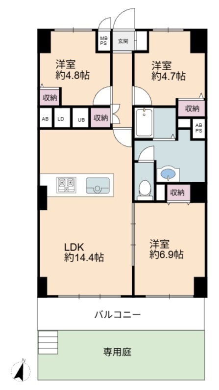 使いやすい3LDKの間取りで各部屋に収納スペースが確保されています。LDKは約14.4帖あり広々とした空間が広がります。南向きのバルコニーと専用庭が設けられておりさまざまな用途に利用できます。