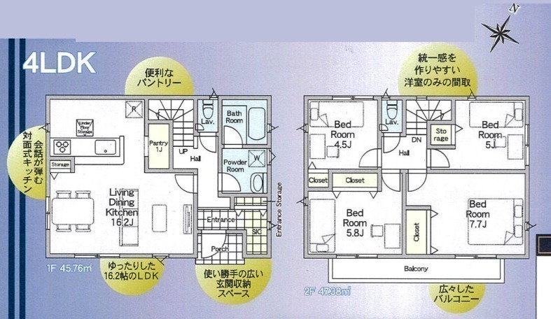全10棟、駐車2台可(車種による)、LDK16帖以上、対面キッチン、パントリー、全居室収納、SIC、浴室乾燥機、主寝室7帖以上、防犯カメラ、ワイドバルコニー