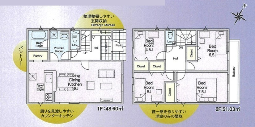 全10棟、角地、駐車2台可(車種による)、LDK18帖、対面キッチン、水廻り集中設計、パントリー、浴室乾燥機、全居室収納、主寝室7.5帖、防犯カメラ、ワイドバルコニー