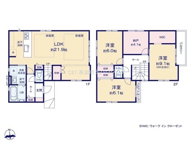 2駅利用可、LDK21.9帖、カウンターキッチン、床暖房、WIC有、リビングイン階段、水廻り集中設計、小学校徒歩2分
