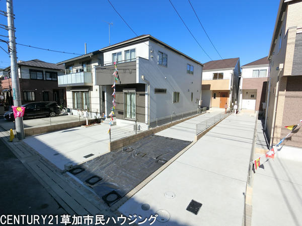 新築の戸建てが並び統一感のある外観が魅力です。明るい外観とシンプルなデザインが印象的です。前面道路が広く車の出し入れもスムーズに行えます。清潔感のあるエントランスもポイントです。