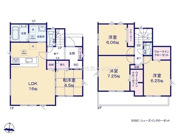 全6棟、三方角地、土地44坪以上、駐車並列2台可、LDK16帖、水廻り集中設計、対面キッチン、全居室収納有、WIC×2、SC、南面ワイドバルコニー、ZEH水準仕様、長期優良住宅