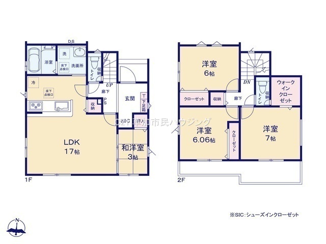 全6棟、南北両面道路、土地40坪以上、駐車並列2台可、LDK17帖、水廻り集中設計、対面キッチン、全居室収納有、WIC、南面ワイドバルコニー、ZEH水準仕様、長期優良住宅