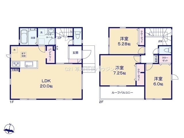 ゆとりある20帖のLDKが広がる1階は開放的な空間設計です。2階には全居室収納付きの寝室を3部屋備え、ご家族みんなの暮らしやすさを重視した間取りです。