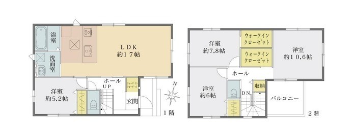 全2棟、土地45坪以上、駐車並列2台可(車種による)、LDK17帖、オール電化、対面キッチン、主寝室10帖以上、全居室収納有、WIC・SIC有、水廻り集中設計、小学校徒歩7分以内