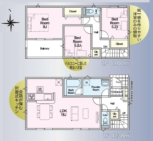 全2棟、駐車2台可(車種による)、LDK18帖、対面キッチン、主寝室8帖、全居室収納有、浴室乾燥機、防犯カメラ、南面バルコニー