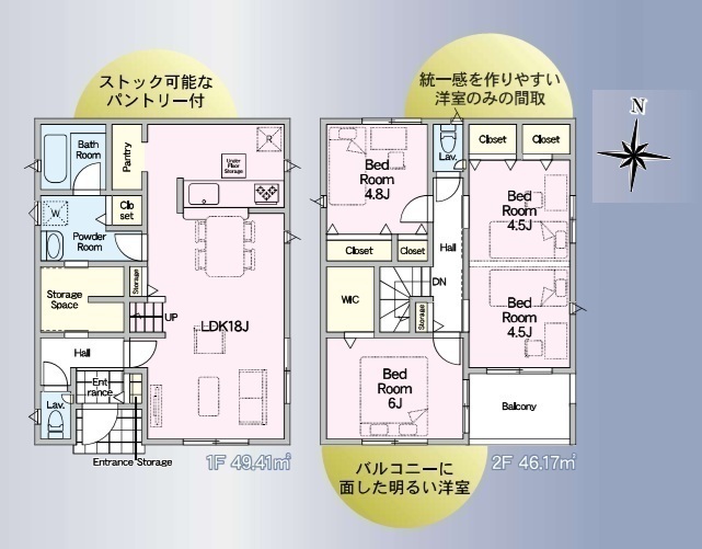 全2棟、南道路、駅徒歩14分、2駅利用可、駐車2台可、LDK18帖、リビングイン階段、対面キッチン、パントリー、WIC、防犯カメラ、ルーフバルコニー、小学校徒歩4分以内