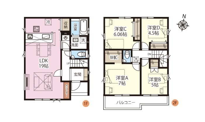 全5棟、南道路、土地41坪以上、駐車並列2台可、LDK19帖、リビングカウンター付、対面キッチン、主寝室7帖、全居室収納有、WIC、南面ワイドバルコニー、ZEH水準仕様、長期優良住宅