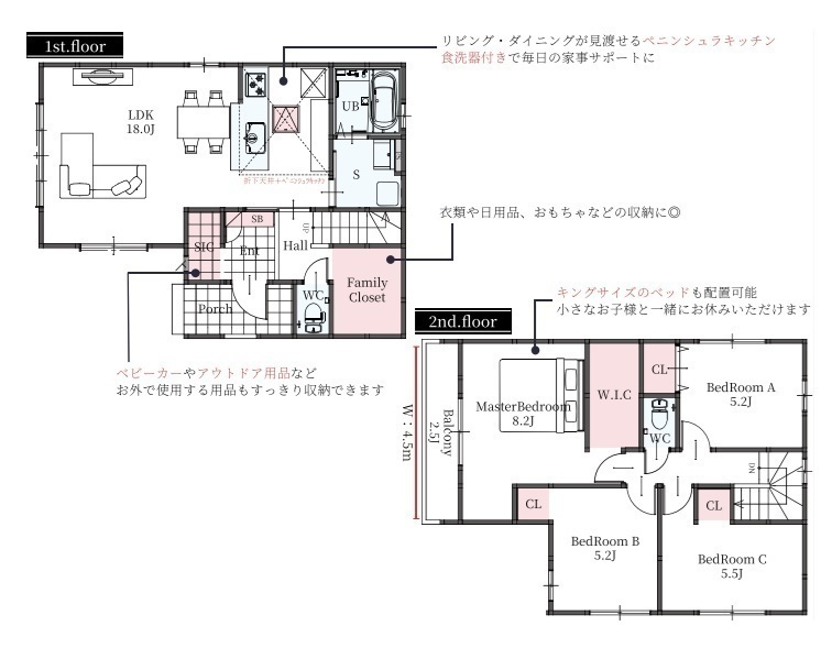 駐車2台可(車種による)、LDK18帖、対面キッチン、主寝室8帖以上、全居室収納有、WIC、SIC、ファミリークローゼット、周辺買物施設充実、長期優良住宅