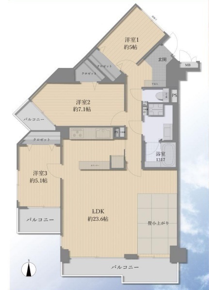 角部屋、ペット可(細則有)、新規内装リフォーム済、LDK23帖以上、LD内畳小上がりスペース、食洗機、主寝室7帖以上、全居室収納有、南面ワイドバルコニー