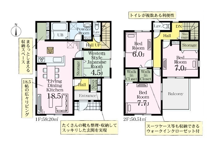 土地51坪以上、南道路、駐車並列2台可、LDK18.5帖、対面キッチン、主寝室7帖以上、全居室収納有、WIC×2、SC、南面バルコニー、長期優良住宅、周辺買物施設充実