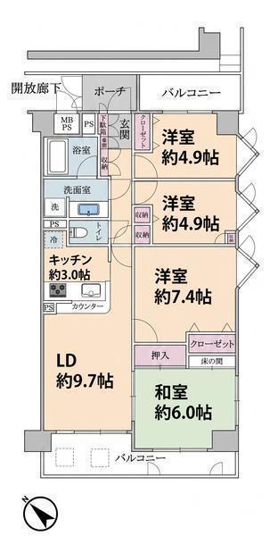 内装リフォーム済、角部屋、バルコニー2ヶ所、対面キッチン、全居室収納付き、スーパー・ドラッグストア徒歩5分